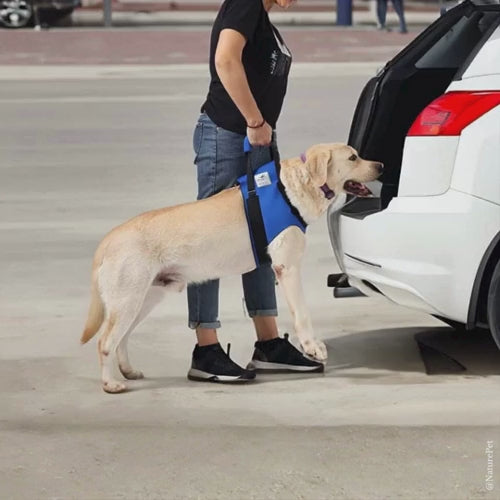 Beim Einsteigen ins Auto bietet die Tragehilfe zusätzliche Stabilität und Kontrolle. Der Hund kann sicher geführt werden, ohne dass schweres Heben erforderlich ist – besonders hilfreich bei Tierarztbesuchen oder auf Reisen.