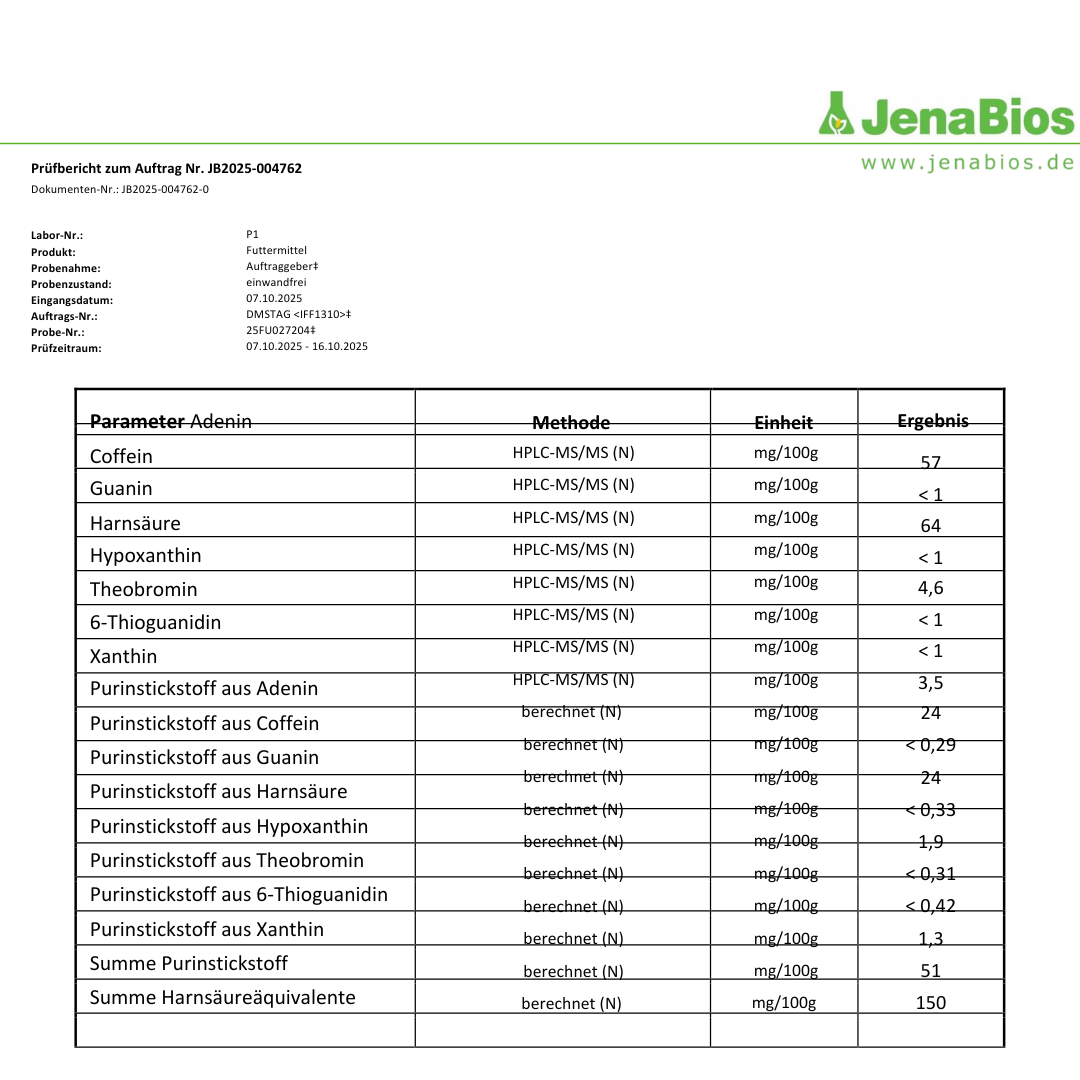 Das Futter wurde im Oktober 2025 von einem unabhängigen Labor mittels HPLC-MS/MS-Verfahren analysiert.