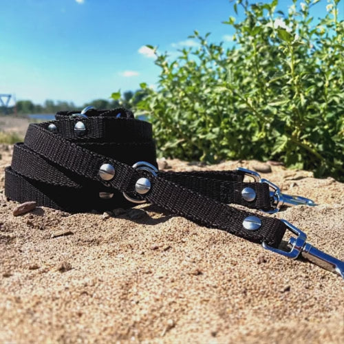 Deux chiens peuvent être conduits sur le RATZFATZ ou vous pouvez créer une poignée d'un côté en clipsant le mousqueton de la laisse dans l'un des anneaux en D.