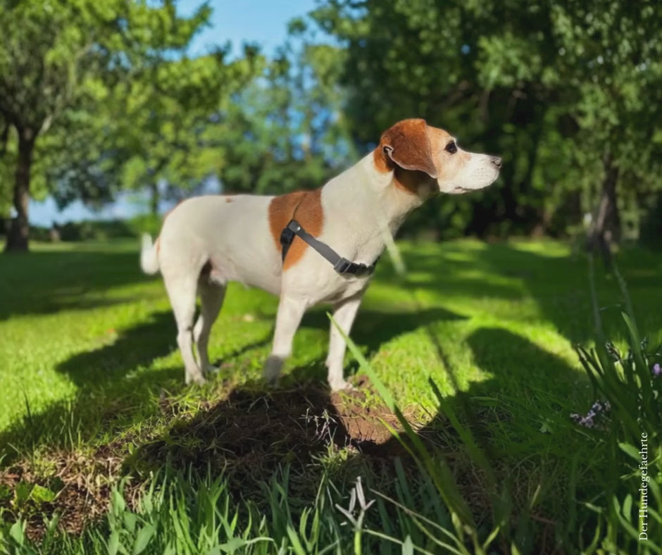 Der Vordergurt ist höhenverstellbar. Dadurch bleibt der Gang frei und natürlich – ohne das typische Problem vieler Vorderführgeschirre, dass Hunde beim Laufen behindert werden.
