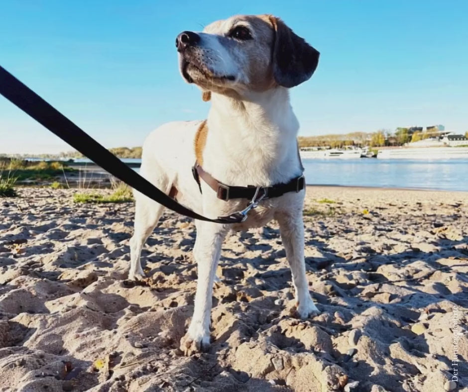 Die Materialbreite beeinflusst die Wahrnehmung in der Vorderführung: Je breiter das Material, desto deutlicher ist das Feedback für den Hund, sobald Leinenzug entsteht. Manche Hunde reagieren bereits auf die leichte Berührung im Schulterbereich. Andere (vor allem hochreaktive Hunde) brauchen in den ersten Trainingswochen eine klarere Reiz-Reaktions-Rückmeldung, um sich sicher umlenken zu lassen.